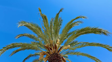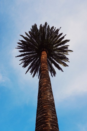 Palm tree with green branches against a blue sky with clouds. Vacation symbol in hot countries. Tropical plant. Space for text.