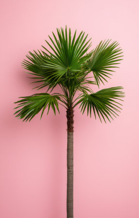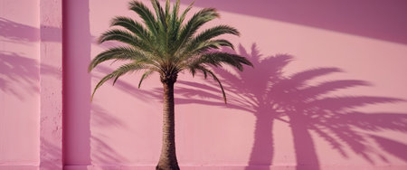AI Generated. Leafy green palm tree casts a shadow on a pink wall