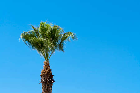 Vacation concept. A palm tree on a windy day with blue sky. Postcard with copy space.