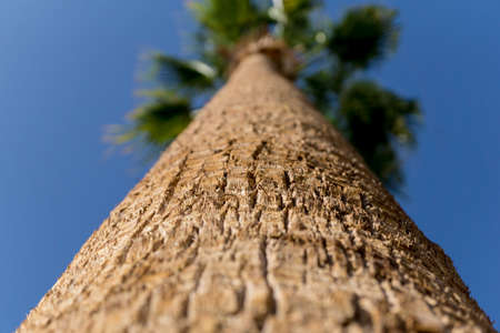 Photo of tall green palm trees against a blue sky with a long wooden trunk