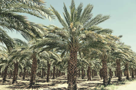 Plantation of date palm trees in Israel. Beautiful nature background for posters, cards, web design. Toned effect