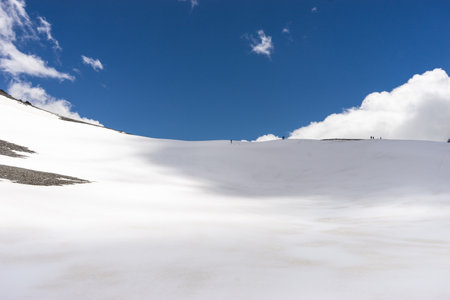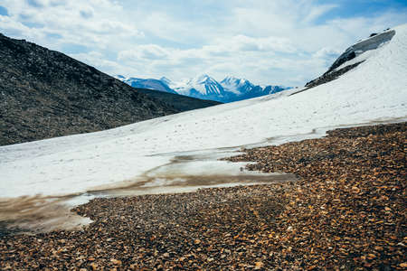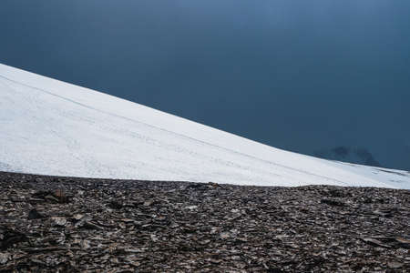 Atmospheric mountain landscape with glacier on rocky hill. Awesome scenery with stony pass with snow in sunlight. Mountain of stones on high altitude. Snow on pass. Beautiful view to highland nature.