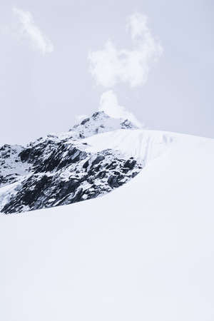 Climbers footprints on steep snowy slope of high snow mountain with rocks on top. Snow-white mountain under blue sky. Minimal landscape with snowy mountain with alpinists footprints at high altitude.