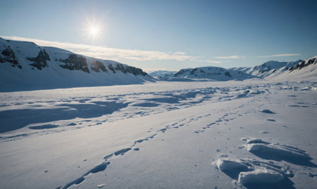 A long trail of footprints leads across a snowy valley in the Arctic