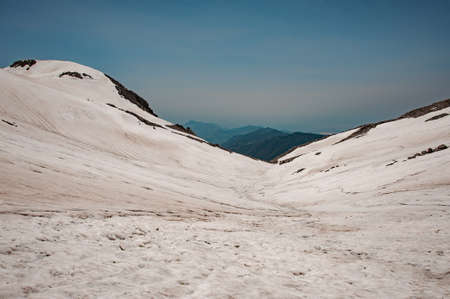 Landscape of the slope covering with dirty snow on the mountain Tahtali