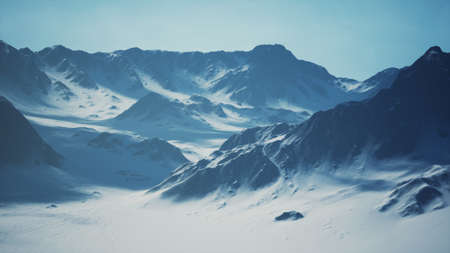 Beautiful winter landscape in Antarctica with snow covered mountains and blue sky