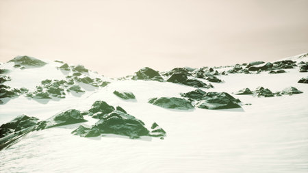 A serene winter scene depicts a vast expanse of snow covering rugged rocks. The bright blue sky above complements the icy terrain, creating a tranquil atmosphere in nature.