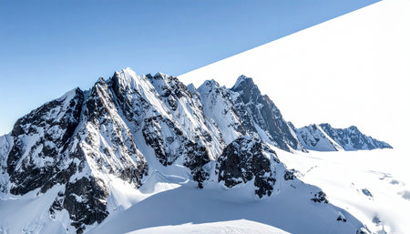A serene snowy mountain landscape with white peaks and a blue sky. The snow-covered mountains stretch towards the horizon, with a clear blue sky above. The scene exudes a sense of calmness and tranquility, with the snow-covered peaks glistening in the sunlight.