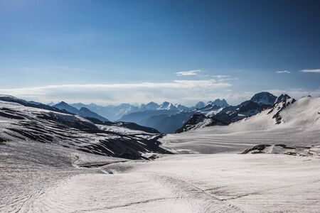 Mountain peak with snow and clear blue sky. Caucasus, Russia