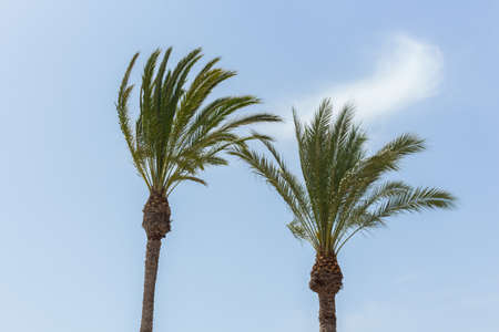 concept for vacation two green palms with a blue sky in the background in summer