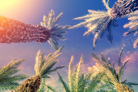 Palm trees against the sky at sunset. Tropical nature background. Palm trees bottom view