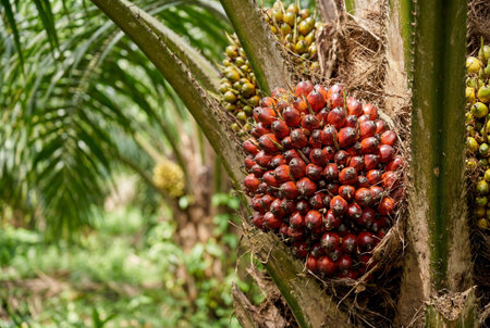 Freshly harvested bunch of ripe red and yellow oil palm fruits glistening with water drops against a blurred background of green tropical plantation foliage.