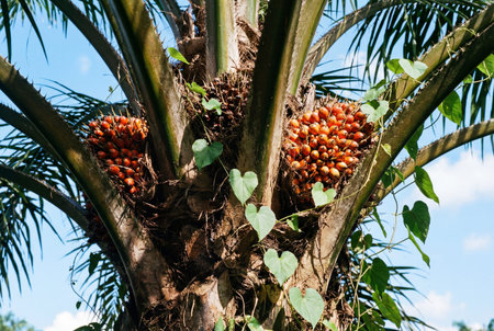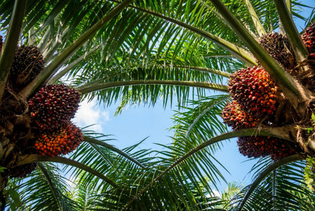 Mature palm oil trees with vibrant green leaves and fruit bunches, photographed against a clear sky, symbolizing tropical agriculture and natural resources