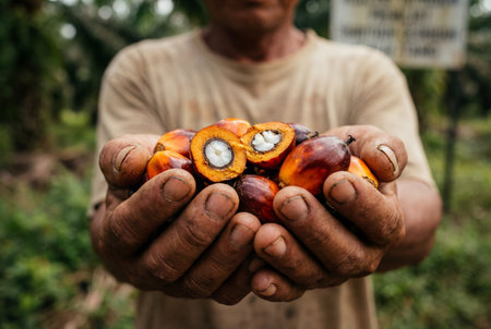 Close up view of weathered male hands holding a pile of fresh red oil palm fruits with one cut open to show the kernel against a blurred green plantation background.
