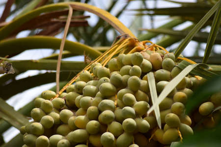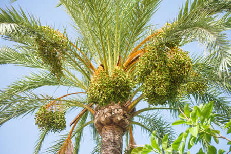 Palm trees with unripe dates on the branches in summer day.