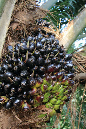 Large bunch of mature dark purplish-black oil palm fruits Elaeis guineensis growing directly from the fibrous trunk of a palm tree, showcasing tropical agriculture
