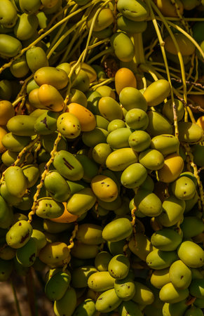 Dates bunches close up growing on a tree in the MIddle East - United Arab Emirates or Saudi Arabia (portrait).