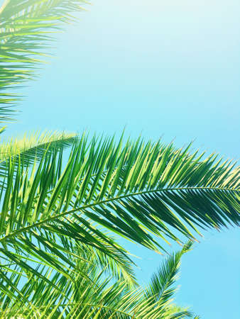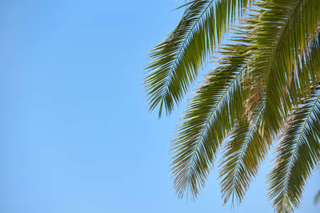 Palm leaves background. Tropical palm branch against the background of clear sky.