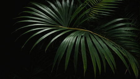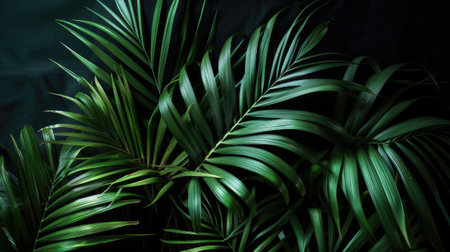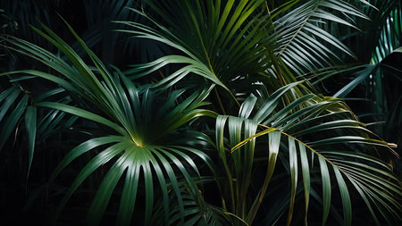 Green tropical palm leaves on a dark background. Tropical forest natural, green pattern.