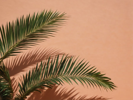 Blurred shadow from palm leaves on the light peachy wall. Minimal abstract background for product presentation. Spring and summer - generated by ai