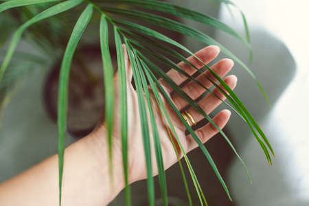 close-up of hand touching palm tree leafindoor next to window light shot at shallow depth of field
