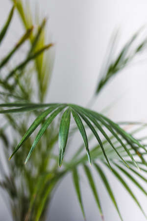 close-up of palm tree with lush leaves in pot indoor on white shot at shallow depth of field