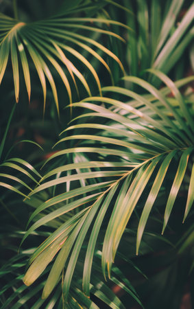 Green tropic plam leaves texture for background in dark tone. Nature backdrop