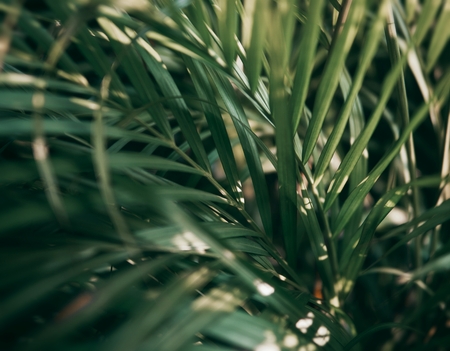 Brunches of palm tree. Green leaves background. Wallpaper with thin palm leaves