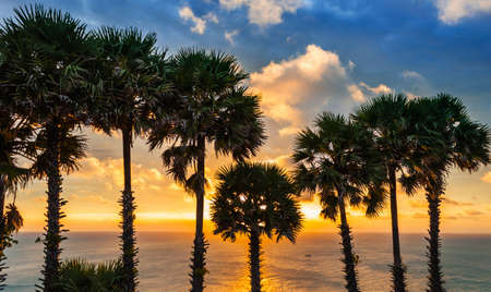 Beach Sunset with silhouetted coconut trees, Ranong Province, Thailand.