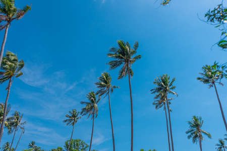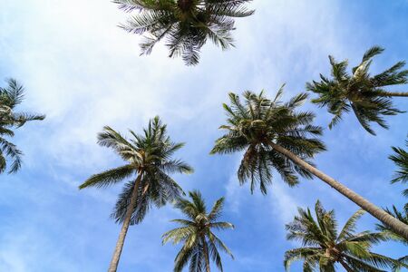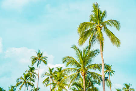 Tropical trees background. Coco palms peaceful blue sky. Exotic summer nature background, green leaves, natural landscape. Summer tropical island, holiday or vacation pattern