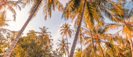 A row of coconut palm trees on summer blue sky background, a beautiful tropical sunset landscape with copy space. Summer holiday and travel vacation concept.