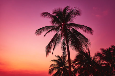 Silhouette coconut palm trees on beach at sunset. Vintage tone. Beautiful coconut palm tree with sky at sunset or sunrise time. The sun setting behind a group of Palm Trees.
