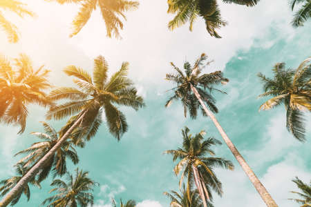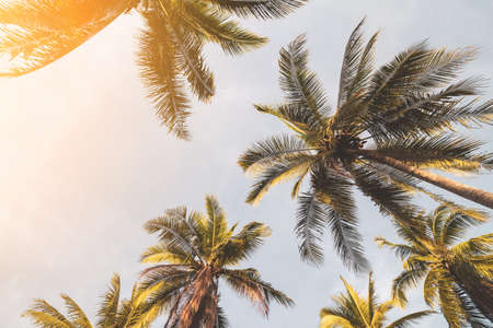 Tropical palm tree with sun light on sky background. Summer vacation and nature travel concept. Vintage tone filter color style.