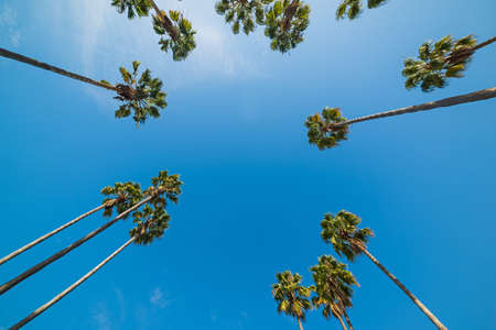 Palms in Los Angeles, California, USA. Summertime aesthetic of Santa Monica and Venice Beach on Pacific ocean. Clear blue sky and iconic palm trees. Atmosphere of Beverly Hills in Hollywood. LA vibes.