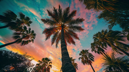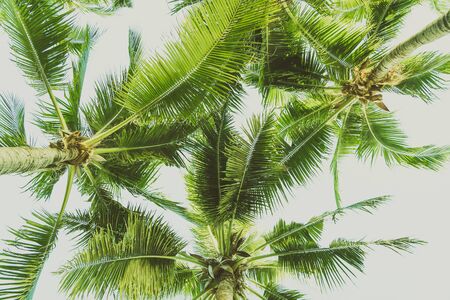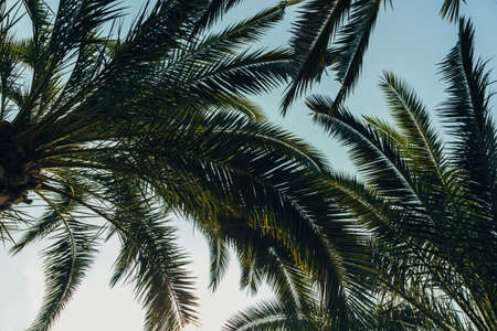 Exotic tropical palm trees at summer, view from bottom up to the sky at sunny day.