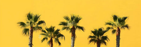 Tall palm trees stand against a vibrant yellow backdrop, basking in the golden sunlight.