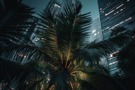 Palm leaves front skyscraper lights. office tree. Generate AI