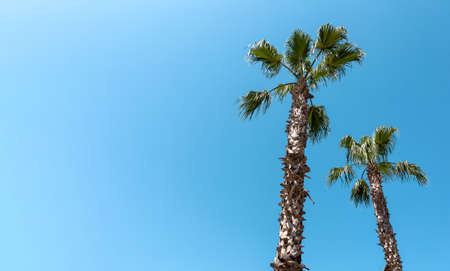 Two palm trees in front of blue sky in sunny summer day