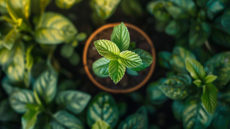 A top view of a green plant in a pot surrounded by other plants, highlighting the lush foliage and growth in a garden setting.