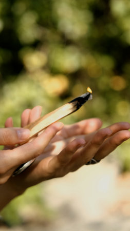 Woman holding smoldering palo santo stick with smoke against natural green leaves background with copy space. Fumigation ritual process. Burning palo santo for meditation