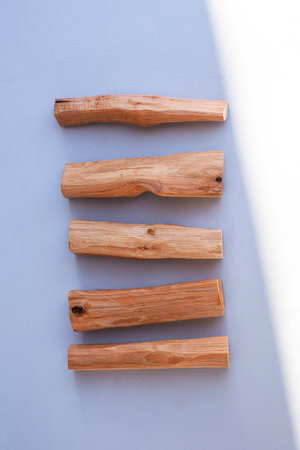 bunch of wooden palo santo sticks on a neutral background. soft focus, macro frame