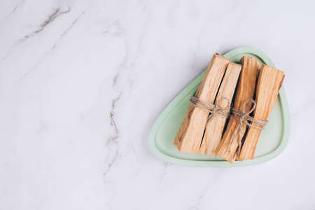 The sacred wood Palo Santo. Flat lay, top view. Copy space for text.
