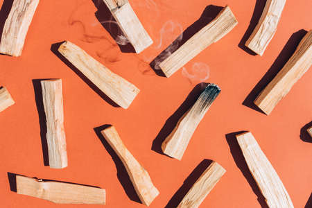Burning incense - palo santo sticks over orange brown background, Earth tone. Flat lay composition with holy wood sticks for meditation and spiritual practices. Room fumigation ritual. Selective focus