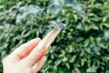 Female hand holding a burned palo Santo wood for creating good energy, green nature background.