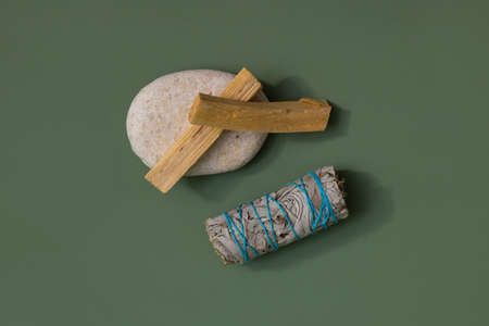 Items for spiritual cleansing - sage bundle, palo santo incense sticks and quartz crystal on green background. Top view. Copy space