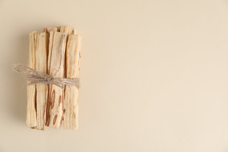 Bunch of palo santo sticks on beige background, top view. Space for text
