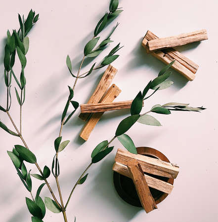 the layout of incense on a neutral background. palo santo and white sage, eucalyptus leaves and wooden stand
