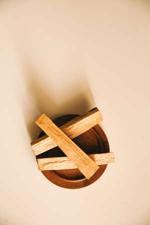 Three sticks of Palo Santo tree on a beige background. Minimal style. Ritual cleansing, meditation, aromatherapy.