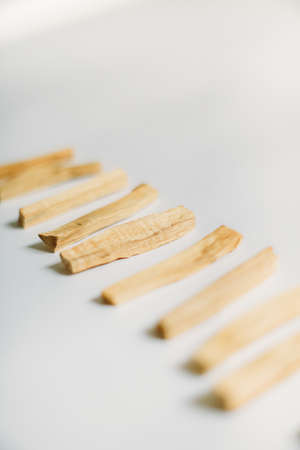 a very beautiful background of wooden palo santo sticks, aromatherapy and the magic of aromas on a white background. Light image blurring, lack of focus, soft texture combinations.