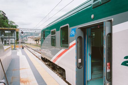 Como railway station arriving train Trenord Italia. Trenord Locomotive Como railway Station. Trenord train carriage. passenger traffic. Local train Italy. Regional train north Italy September 20, 2019